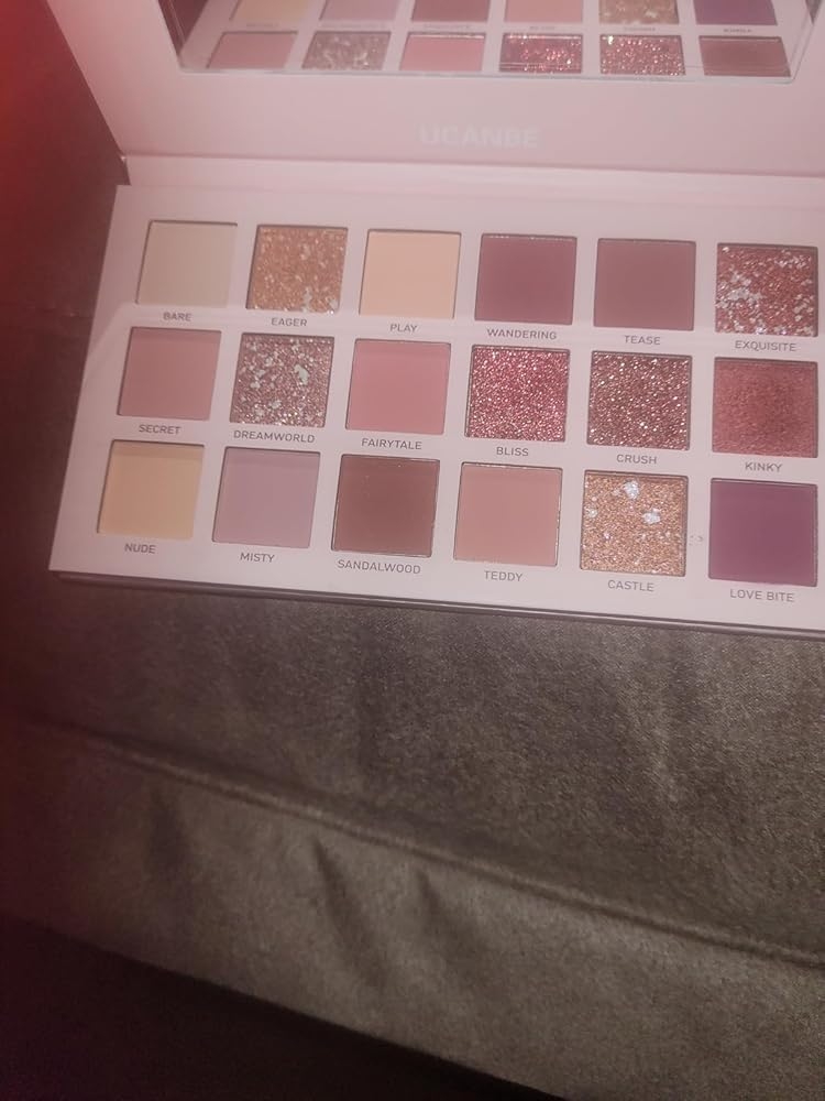 This 18 color pallet offers beautiful shades of highly pigmented shadows. This is the second UCANBE pallet I have purchased and it has also exceeded my expectations. The shadows blend very well with ease, and remove easily with micellar water. The sparkles, shimmers, and the matte shadows are all beautiful. One thing to note that I found on this pallet many customers may find helpful…On the back of the pallet the ingredients for EACH INDIVIDUAL shade is noted on back. If you have skin sensitivities to certain products this perhaps would be most beneficial to you and for this reason I add my 5th star. The cost of this pallet is more than reasonable, and quality compares to high end pallets! Give this one a try! I am certain you will be as pleased as I am! Psst, It’s a HUDA DUPE! I was sure it was, needed to confirm first, lol.